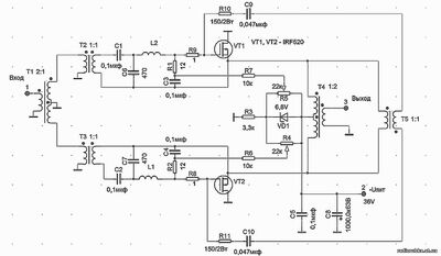 Дальше у него по схеме уже правильно: https://f5npv.wordpress.com/wp-content/uploads/2021/09/irf530-5.jpg Так диоды ставить может только новичОк.