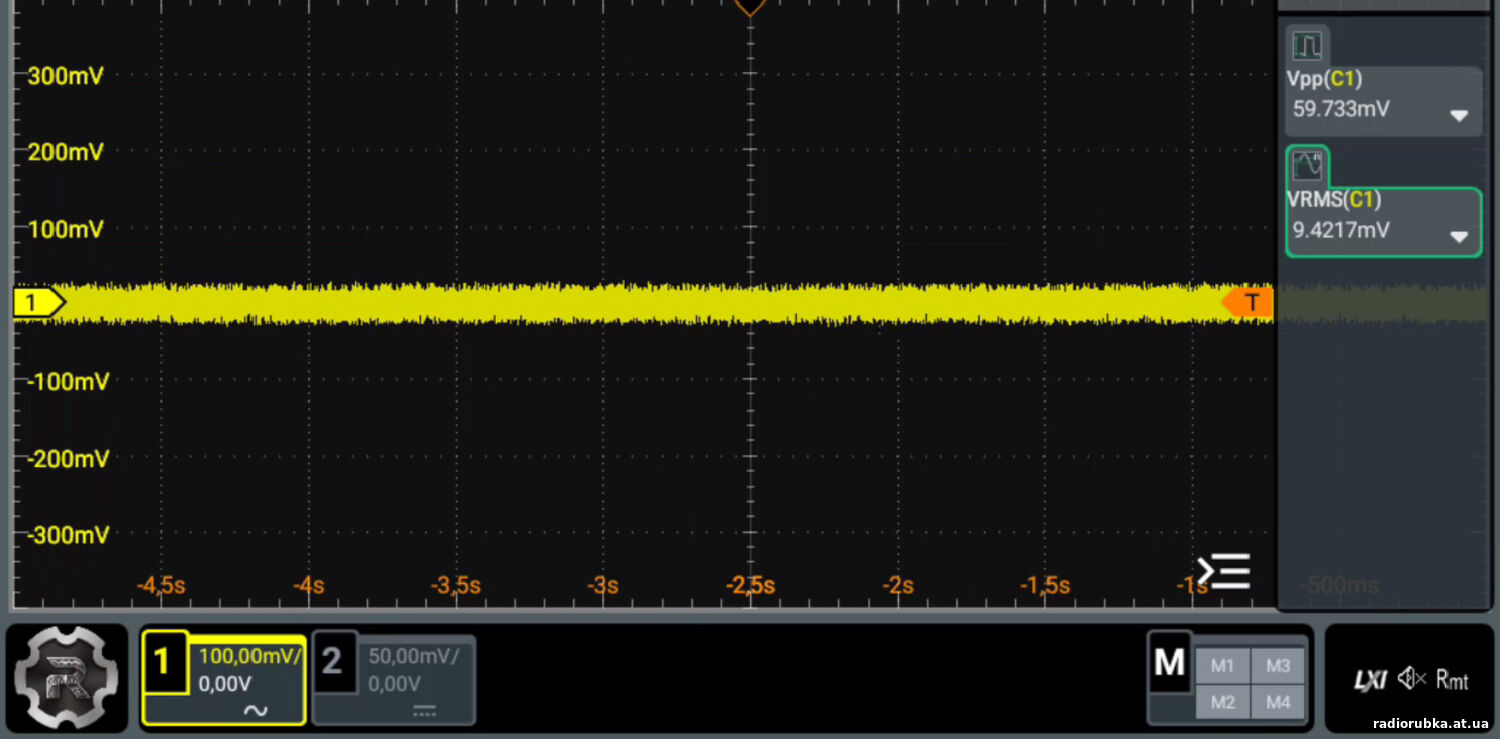 Пульсации при 100Ом нагрузке, припаял на ножки 100мкФ электролит, 59.7мВ п-п