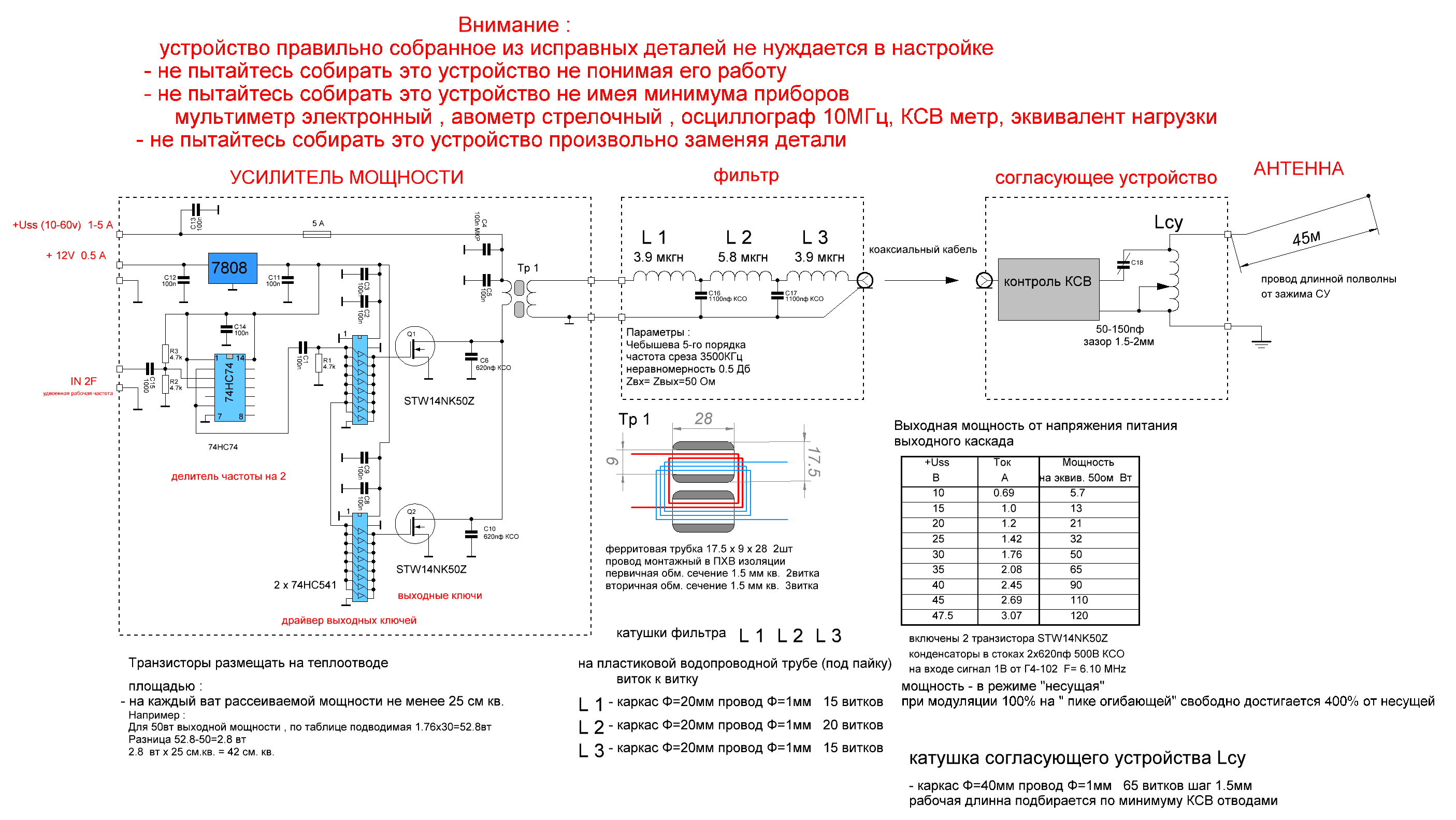 | Здравствуйте, скажите пожалуйста, сколько нужно дать напряжения питания на эту схему передатчика, чтобы получить 50 вт в режиме несущей? При 20 вольтах потребляет 1 ампер, трансформатор на трубках 2:6 витков, нагрузка 75 ом. Долго разбирался, так и не понял, не совпадает у меня потребляемый ток с таблицей на схеме. Если шпт на выходе намотать по схеме 2:3 витка, то потребляет еще меньше. Фильтр намотан под 75 ом. Трубки не греються, радиатор 10 х 15 х 3 см грееться но не сильно. Транзистора стоит 2 штуки, емкости по 670 пф на каждый, синус чистый.