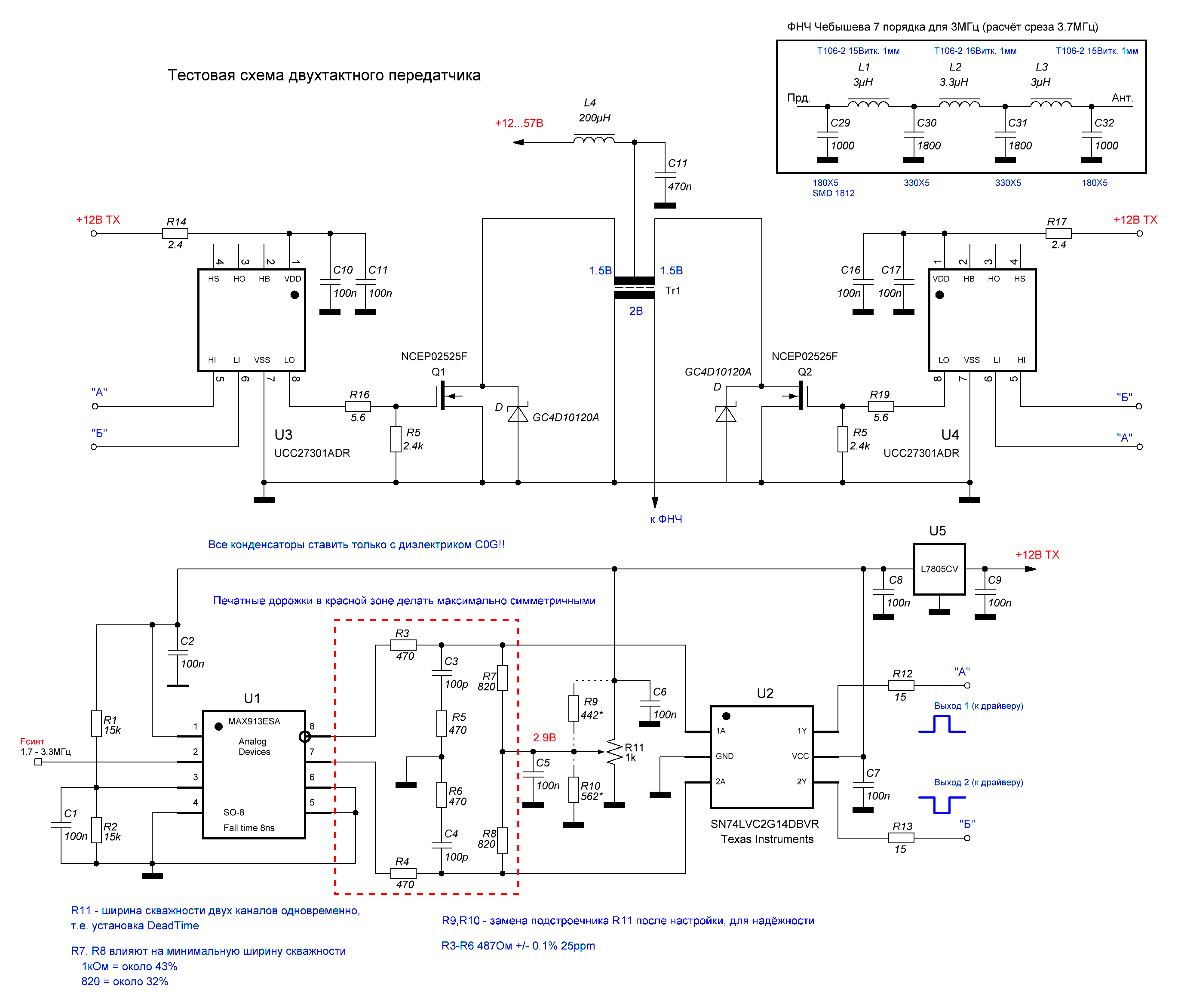 | Вариант 2. Двухтактный передатчик, это по-сути два однотактных. А при проектировании класса Е(ЕШ) очень хорошо показала практика, между сток-истоком полевиков ставить карбид-кремниевый диод Шоттки на 1200В. Он работает в качестве конденсатора, но, без сильных ВЧ звонов.