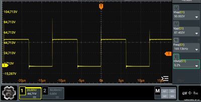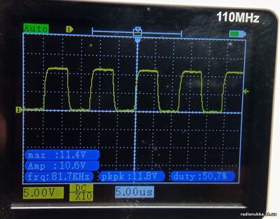 ВЧ звон почти полностью пропал, при сохранении хороших фронтов. Вот такой сигнал на выходе модулятора при 100В силовом питании и скважности в 95%