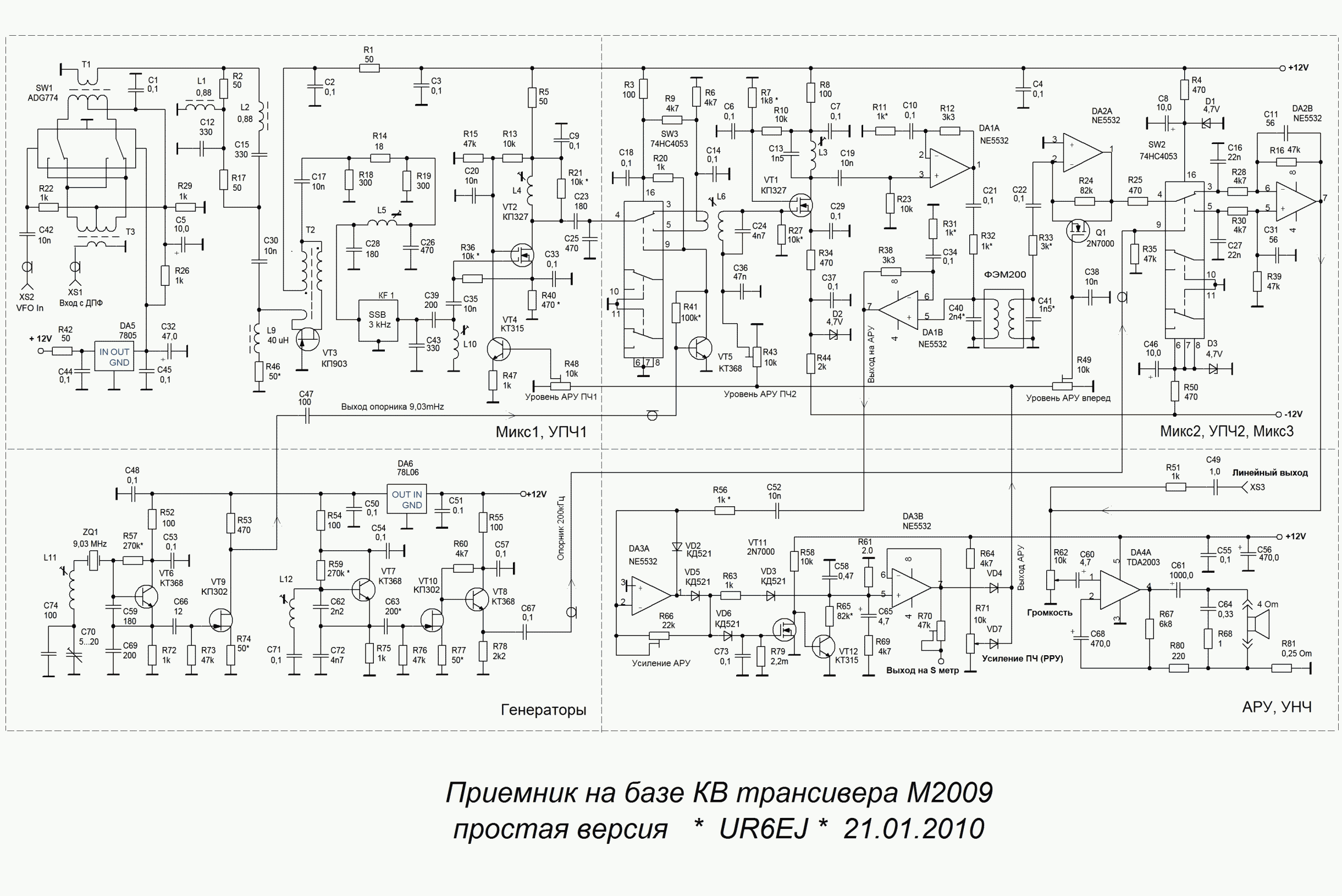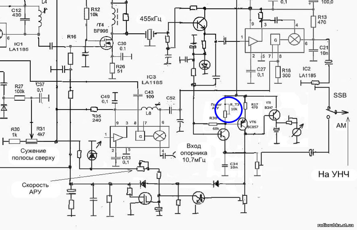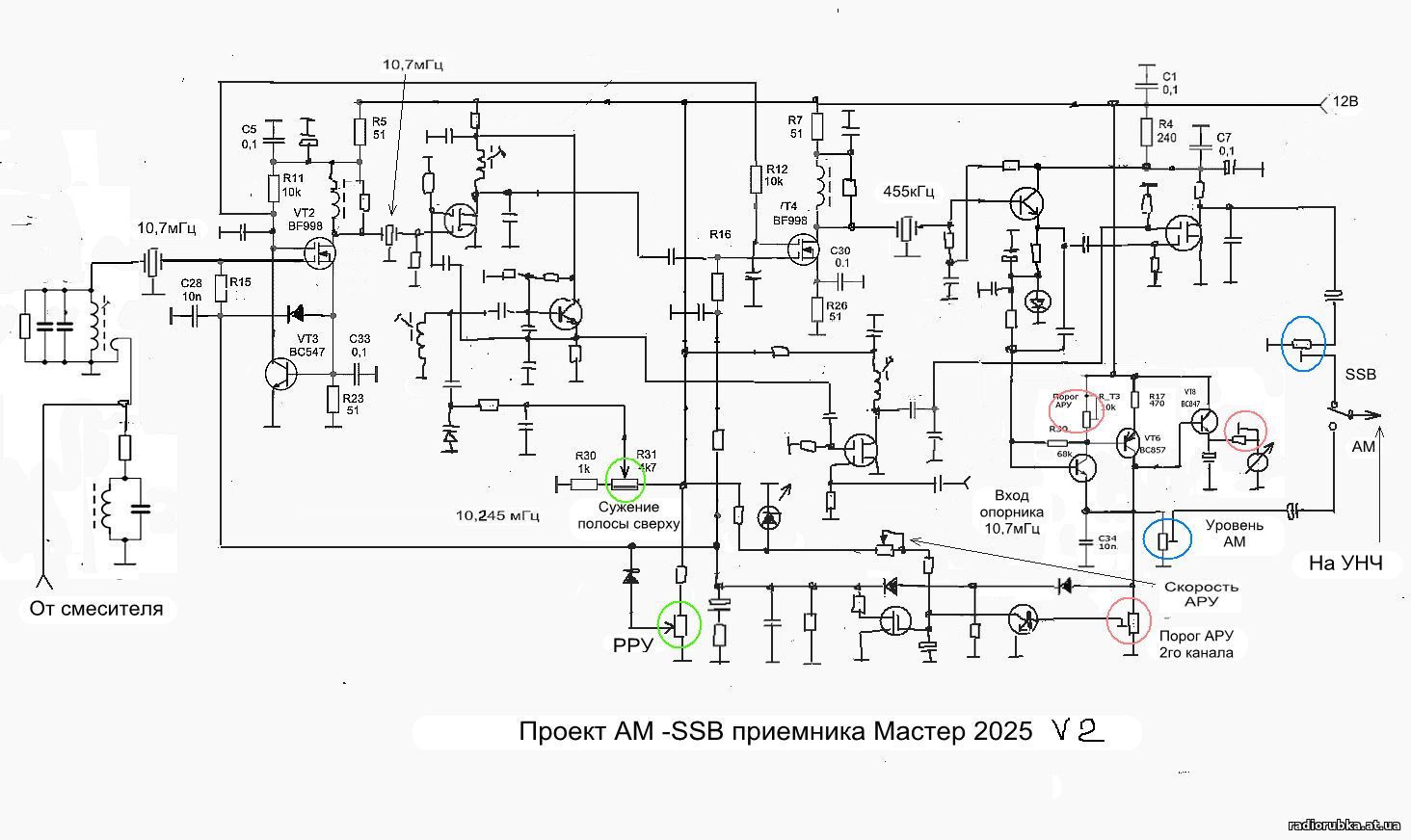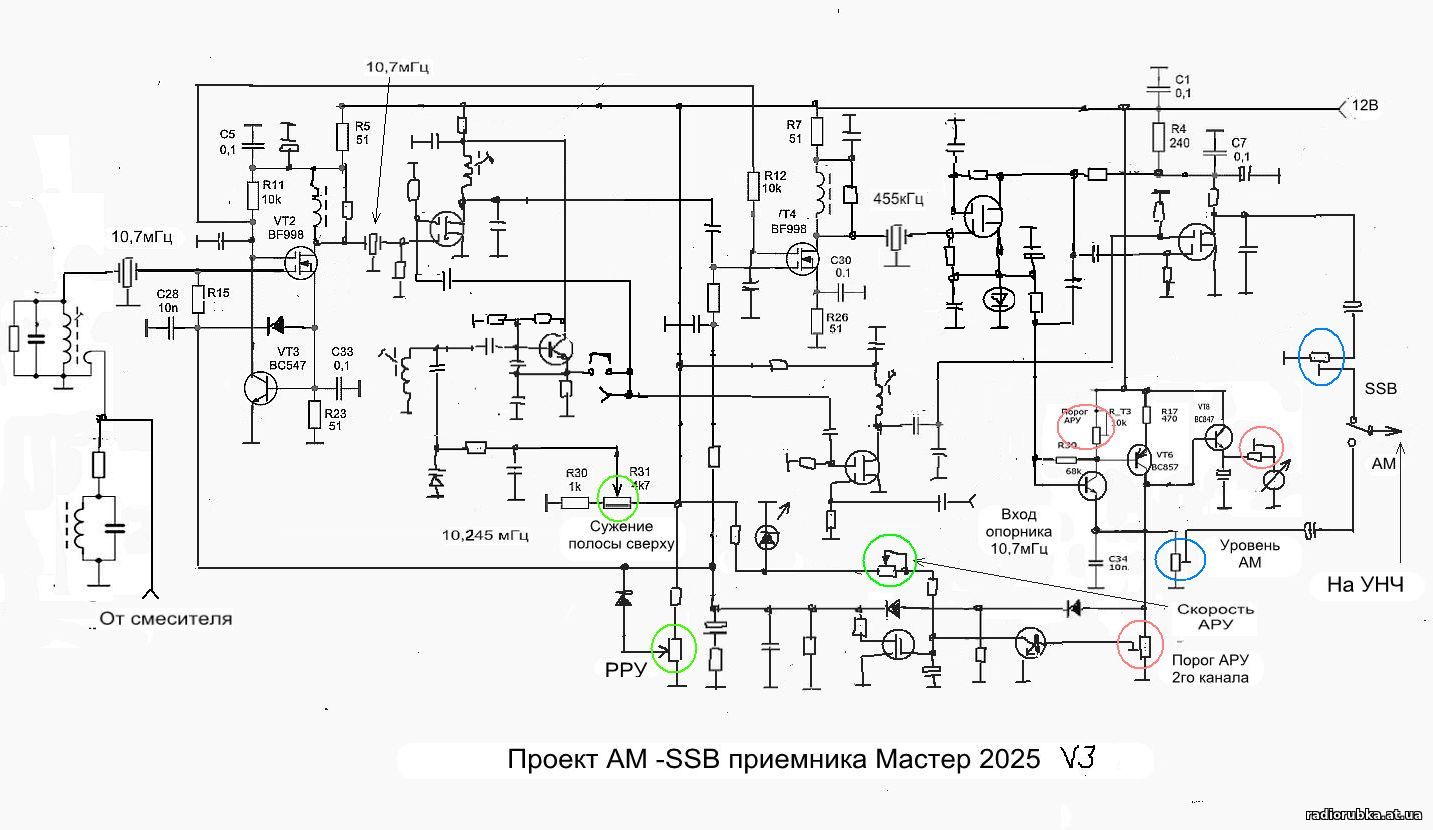 Что уже есть в схеме 1. Плавное сужение полосы сверху от 6кГц 2. Стандартные фильтры на 10,7 мГц (желательно на 6кГц) -2 шт и на 455 кГц (можно на 465кГц) тоже на 6кГц шириной 3. Честное формирование АРУ с плавной регулировкой времени отпускания. (важно для SSB) 4. Глубокая (не меньше 80дБ) + линейная регулировка АРУ с задержкой по уровню. 5. S метр не привязан к задержке АРУ, будет работать до начала ее работы. 6. ВысокоУровневый 1й каскад усиления с ОС в исток, поднимает ДД.